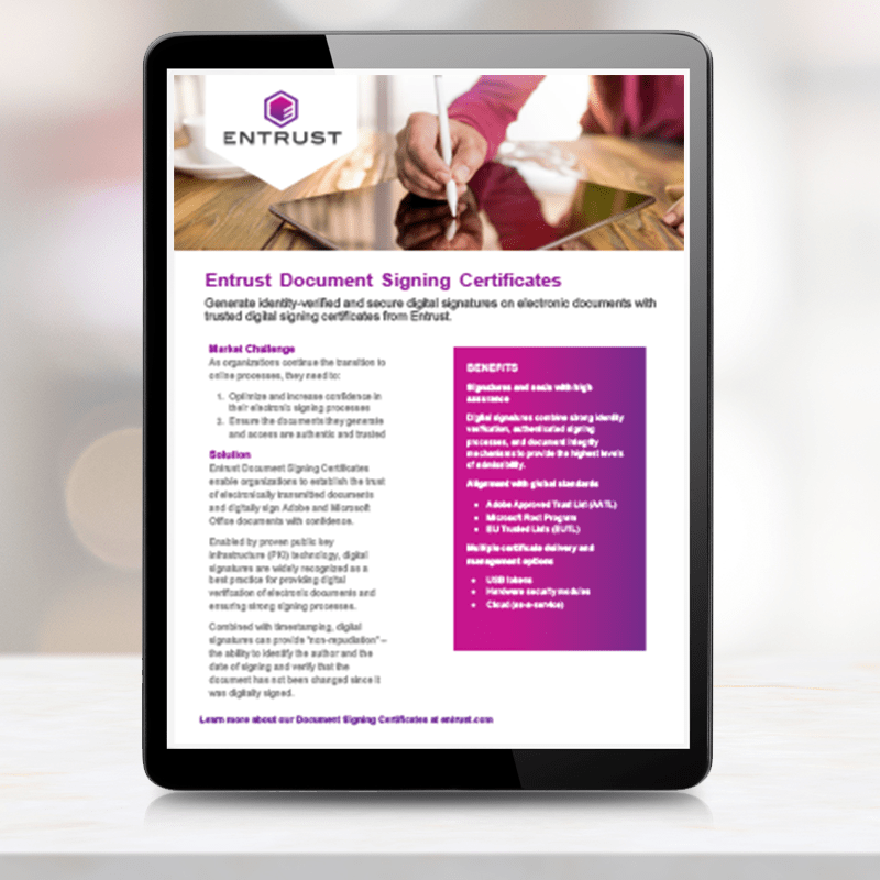 Entrust is a long-standing expert in certificate-based digital signing solutions, PKI infrastructures, identity verification solutions, and identity management solutions. This unique combination of expertise and in-house products makes us a leading provider of custom solutions for identified signing. We go through stringent audits and certifications to ensure our services are trusted across organizations, software, and operating systems globally. Our accreditations show our dedication to providing the best solutions and support. We are: