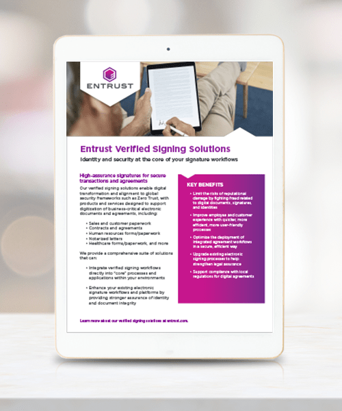 Consumers, citizens, and businesses now expect transactions to be done digitally and remotely, in an easy and secure way. Entrust can help you keep your online transactions and agreements under control and expand your Zero Trust practices to the front office with high-assurance, identity-verified signature solutions.